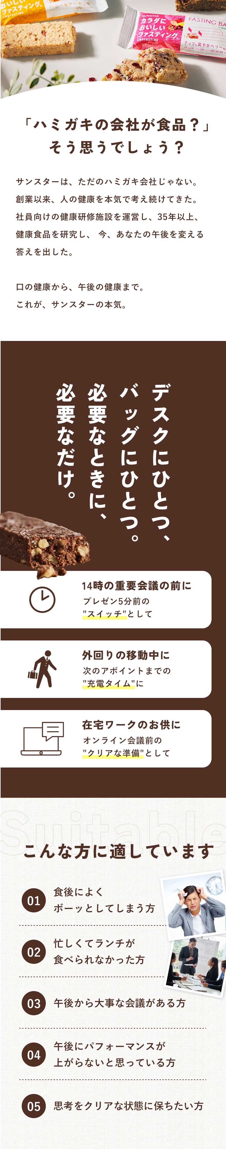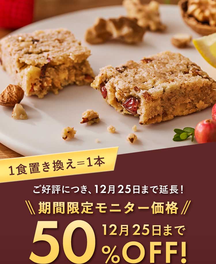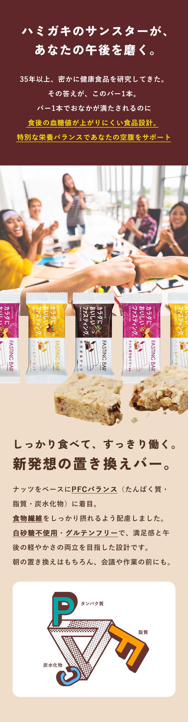 良質な植物性脂質を豊富に含むアーモンドやくるみなどを固めたナッツバーです。食物繊維も約6gと豊富に含まれています。独自のPFCバランスであなたの「空腹」をサポートします。